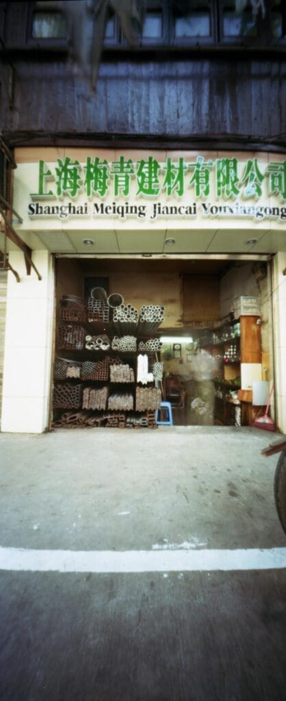 Cork – Shanghai – Celebrating 20 years of friendship When I visited Shanghai I was fascinated by the way the small shops, often under tall buildings used for other functions, spread into the pavements. Yhe pinhole long exposures give a sense of the presence of proprietors and customers but it is the products they sell that dominate visually. The glaring exception was in the Apple outlet